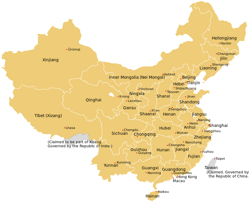 - 4 เขตเทศบาลปกครองตนเองภายใต้การกำกับดูแลจากรัฐบาลกลางโดยตรง ได้แก่ Beijing, Chongqing, Shanghai, Tianjin