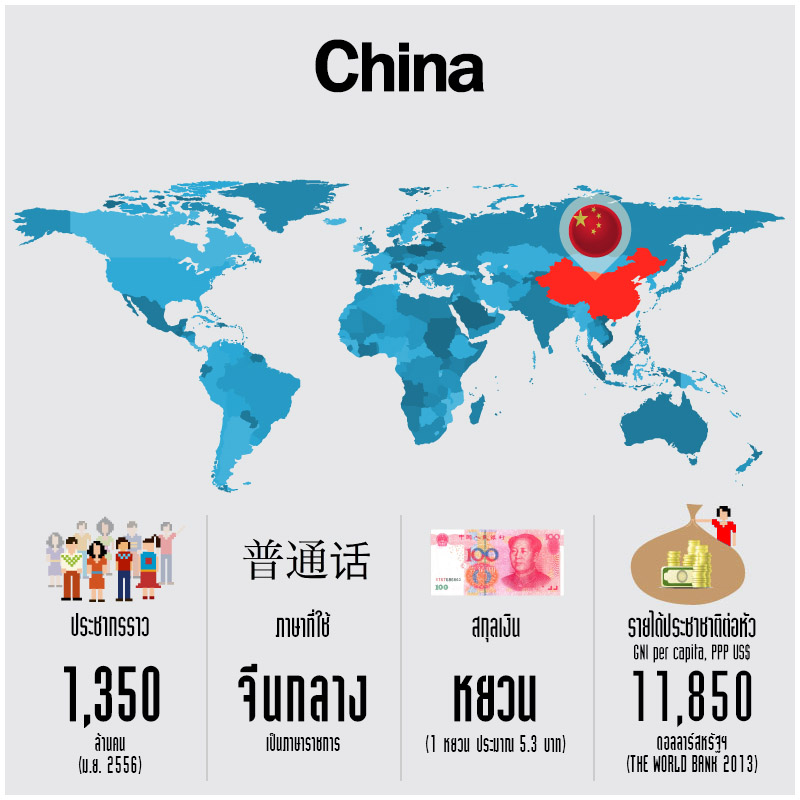 จีน (china) เริ่มก้าวขึ้นมาเป็นมหาอำนาจทางเศรษฐกิจของโลก และมีบทบาทสำคัญในการขับเคลื่อนเศรษฐกิจโลกเป็นอย่างมาก เนื่องจากมีฐานะเป็นทั้งผู้ผลิตและผู้บริโภครายใหญ่ ประกอบกับมีนโยบายพัฒนาประเทศอย่างก้าวกระโดด และด้วยความที่จีนเป็นตลาดที่ใหญ่มากในเอเชีย มีประชากรและกำลังซื้อที่สูง โอกาสที่ผู้ลงทุนรวมถึงนักธุรกิจไทยจะเติบโตไปพร้อมกับตลาดจีน จึงมีโอกาสค่อนข้างสูง นอกจากนั้นยังมีปัจจัยหนุนอีกหลายประการ ไม่ว่าจะเป็นความคล้ายคลึงทางวัฒนธรรม การมีเส้นทางขนส่งที่เชื่อมถึงกัน และความสัมพันธ์ทั้งทางด้านเชื้อชาติ การค้าและการทูตที่มีต่อกันมายาวนาน