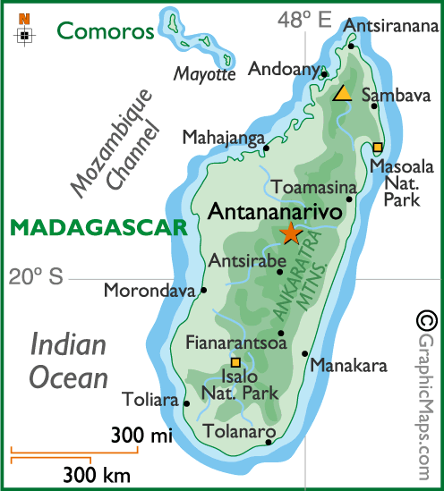มาดากัสการ์เป็นเกาะตั้งอยู่ในมหาสมุทรอินเดีย อยู่ทางตะวันออกเฉียงใต้ของทวีปแอฟริกา ตรงกันข้ามกับประเทศโมซัมบิก มีพื้นที่รวม 592,000 ตารางกิโลเมตร ลักษณะภูมิประเทศเป็นที่ราบแคบๆ ชายฝั่ง ตอนกลางมีที่ราบสูงและภูเขา